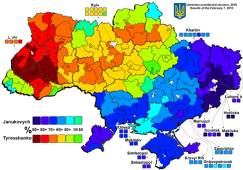 Kartet viser resultatet av presidentvalget i 2010, og illustrerer at Ukraina er et delt land. President Janukovytsj som ble kastet etter demonstrasjonene i Kiev 2014 fikk over 90% av stemmene i flere av valgdistriktene. Han hadde et klart flertall i alle regionene i Øst-Ukraina. Motkandidaten Tymosjenko fikk klart mest stemmer i de vestlige regionene.
